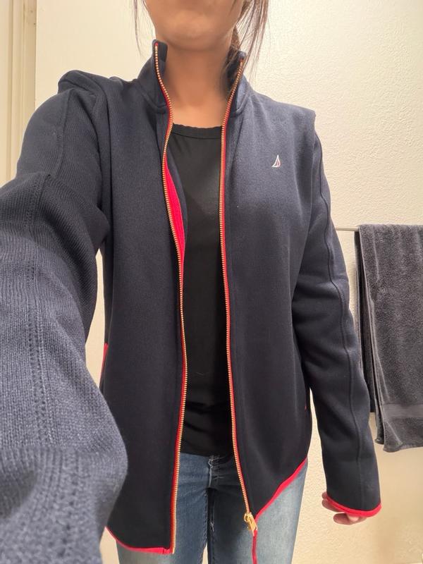 I love this women’s Nautica sweater fleece zip-up jacket. It’s soft, warm, and really comfortable without feeling bulky. The fit seems a little bigger than I expected. I got a medium and would probably fit better in a small. The sleeves are a touch wide and long but I’d look at the website for proper fit guide. However, it’s perfect for layering on cooler days, and the quality feels great for the price. I’d definitely recommend it!