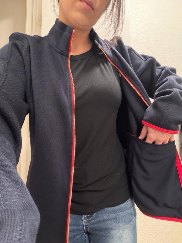 This is a wonderful sweater “jacket”. The sleeves are a little generous lengthwise but nothing insurmountable or warrants sending it back. Very well made and attractive - metal zipper and contrasting piping on the zipper and pocket edges. Overall a winner and worth the price on sale! Wish there were more colors, I’d buy another.
