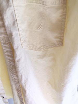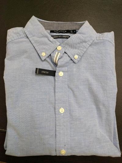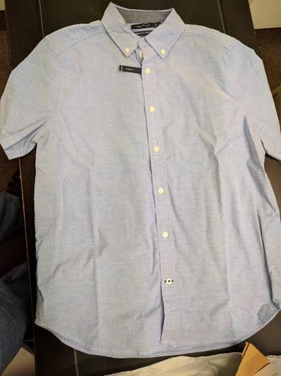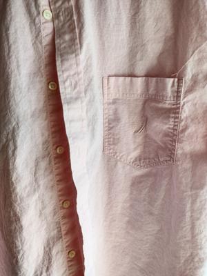 Wrinkles a lot. It has a black stripe running down the line of buttons that doesn't show up on the website picture because it's mostly hidden when the shirt is buttoned. It's not a flaw ; I just didn't see it beforehand and don't necessarily like.