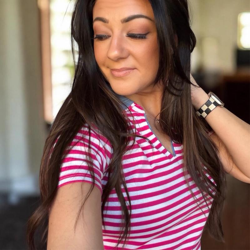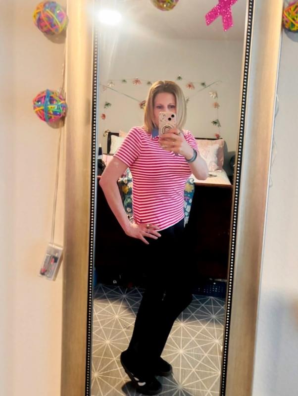 I love the denim collar trim on this shirt…..makes it a little dressier than a plain tee. Fabric has a good weight to it and is well made. Its long enough to tuck in if desired or wear loose. Fits true to size.