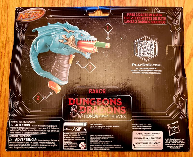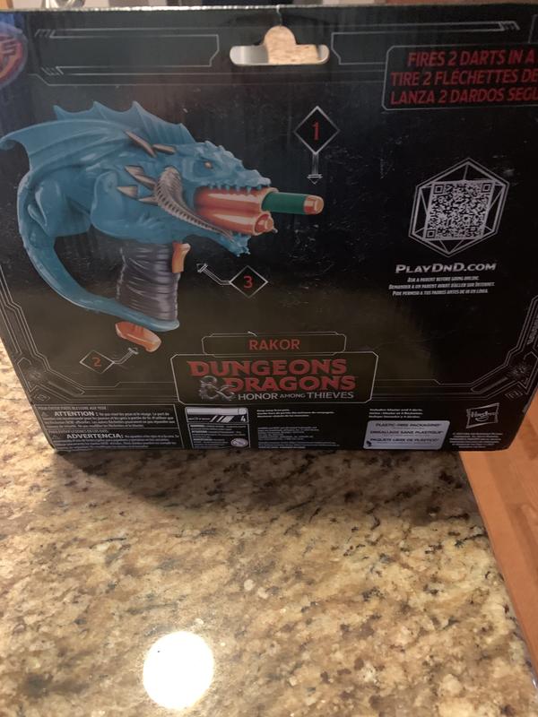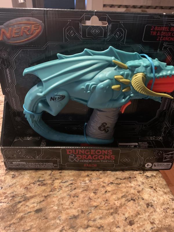 The NERF MicroShots Dungeons and Dragons blaster, as inspired by Rakor, is one my son's favorite designs in his collection of NERF toys thus far! Artwork alone on the dragon is beautiful and looks awesome! Has a double dart blaster that my son loves! Great for both indoor and outdoor play for both boys and/or girls! Packaging was great and easy to come off. I would definitely recommend!