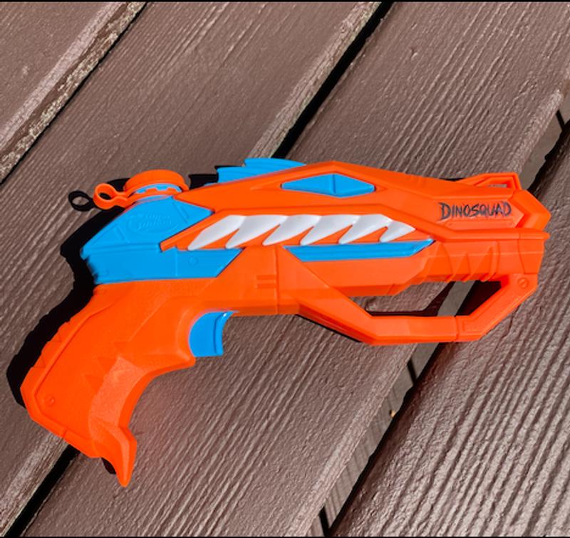 My son loves this Dinosquad Raptor water gun, and has played with it for hours on end. My son and I both love that he is able to open and fill the water gun independently making his frequent fill ups faster and easier for him! It doesn't have alot of weight to it when it's full of water making it easy to run around with and play. He loves dinosaurs so this gun was all around perfect for him!