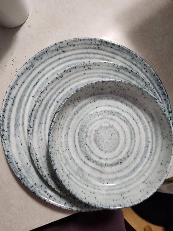 Natura 4 piece place setting in this beautiful blue swirl. I was so excited when I opened the box but then I was quickly disappointed as I only received the 3 piece blue swirl and it was advertised with the black serving bowl which gave the set an edgy look. I received a broken piece of the black bowl not the entire bowl therefore it was not damaged in shipping it just was not included in my box set, I will have to give it 4 stars as it had a missing piece. The set is gorgeous which you will see in my photos, the dishes are a very nice weight not too heavy but of a substantial weight, actually has the expensive look of china/pottery, I am very happy with the fact that this entire set is dishwasher safe, chip and scratch resistant which is a great feature as I have always had to replace other brands because of the scratches on the plates which are not very attractive ! I also bought the set because it is microwave safe but impressively oven proof as well, very rare to find features