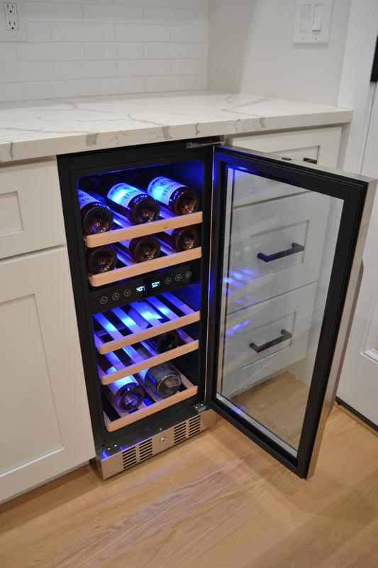 I had previously purchased a Newair ABR-1770 to store my beer and soda and had been happy with it for over a year so when the wine cooler went out I decided to purchase this unit with 2 cooling zones but cheaper than other units with only one. The wood shelves slide very nicely for access to my bottles and I love having separate temps for my red and white/rose'. Very quiet and looks like a built-in.