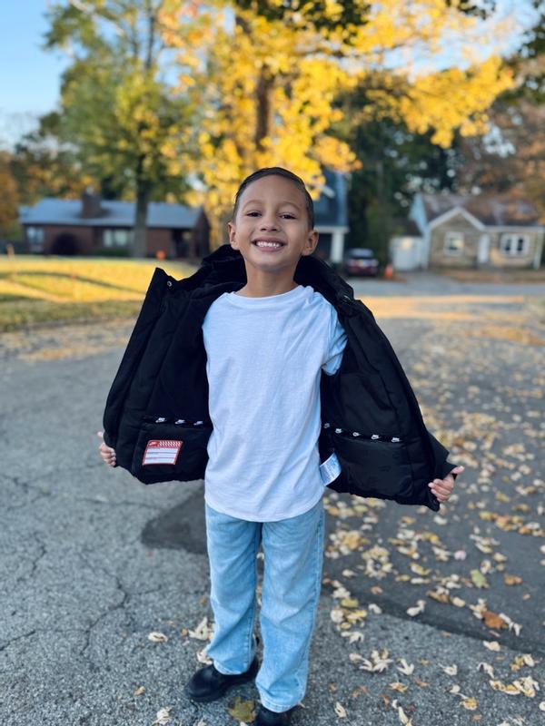 This is the perfect winter jacket for your little one! It’s super thick and the inside is lined with a soft, warm fabric. The outside is made with water repellent fabric, which makes it perfect to wear when it rains or snows. It’s also just a generally great looking jacket! My 6 year old LOVES it. It’s true to size, and I wish I’d sized up so my son could wear it for a couple more years. Oh well. I’ll probably repurchase in a larger size when the time comes.