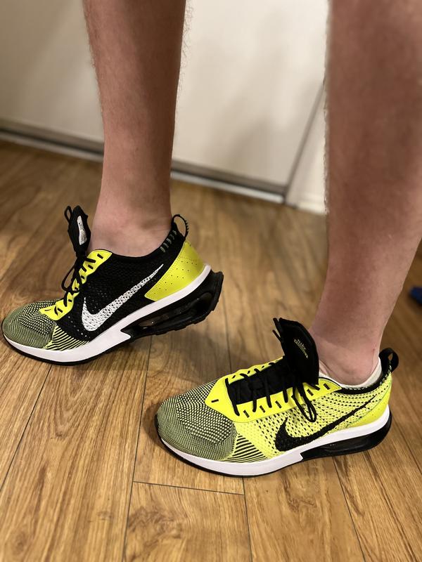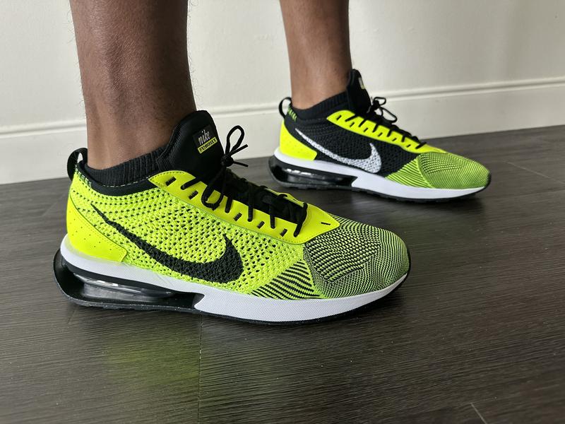 Flyknit Racer shoe runs big, slipping at the heal. It seems like the effort to make the shoe thin and light weight took away from the heal support. Durability for a lower rating due to visible shoe ware such as toe indentation after two wears. The design and color combination is a 10 out of 10. Not only are they fashionable to wear but the neon yellow is a safety color at night. The tongue of the shoe is unique, possible something new with the design and was a big hit!