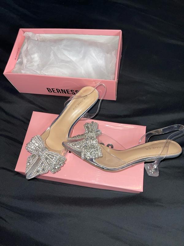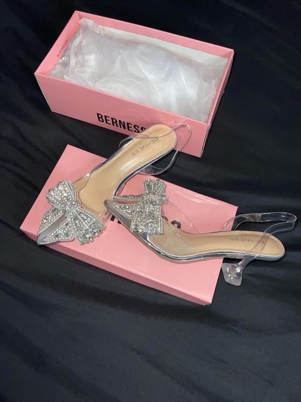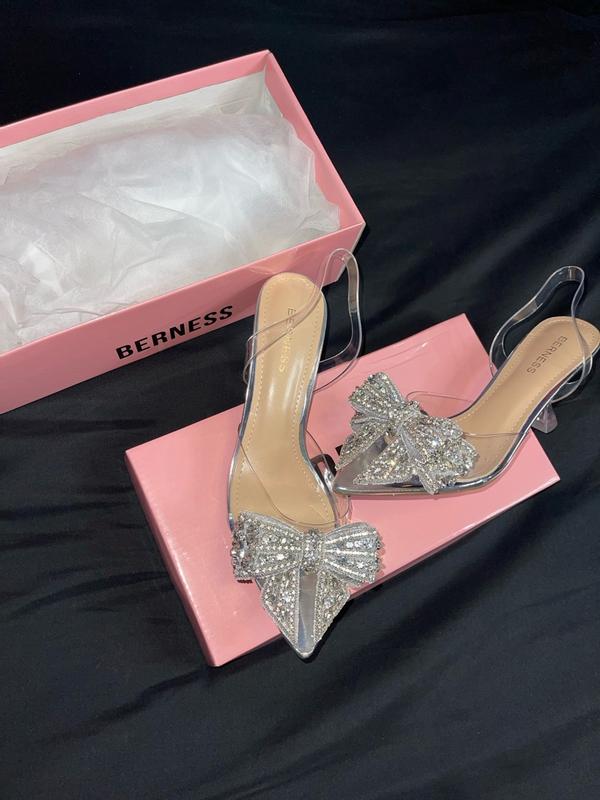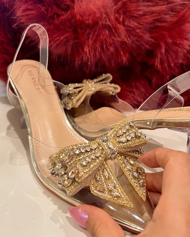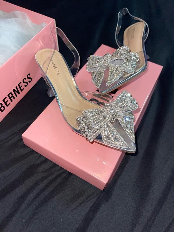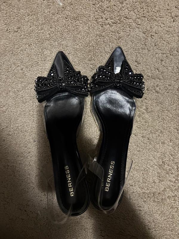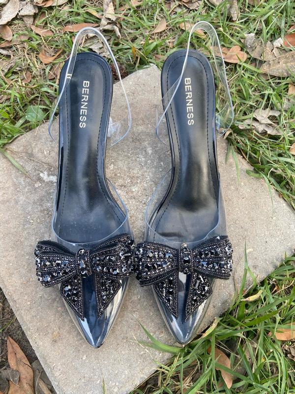 Berness style Nina is a crystal black bow with clear heels. These shoes are gorgeous and look great with any style! Although my feet were a little too wide they still felt super comfy on. They move with your foot making them very flexible. Made with great craftsmanship with straps that hug the back of foot. I can wear these with something casual or dressy. Really love them!
