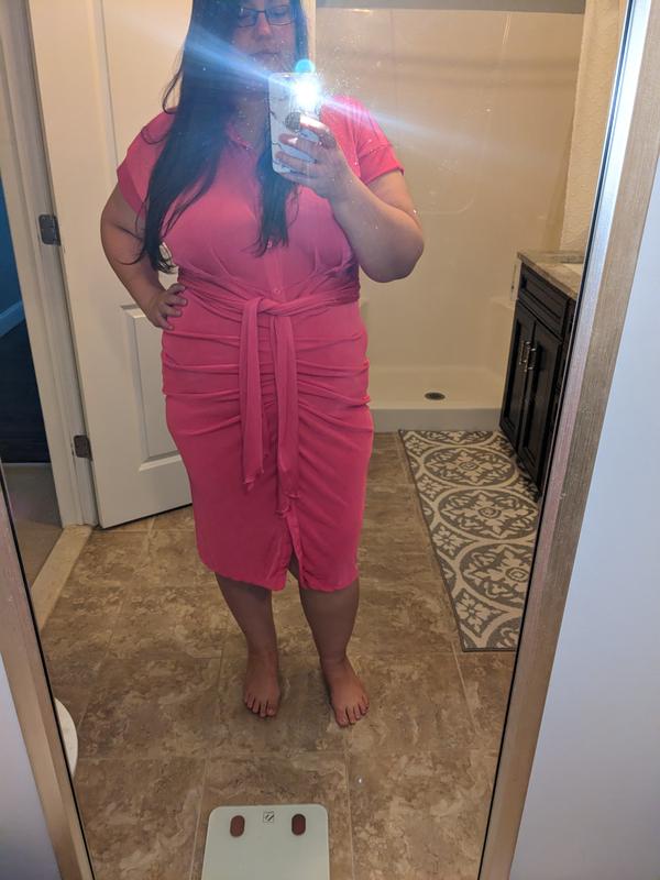 My normal size is 20-22 plus size. I had never ordered from this particular designer and reading the reviews I ordered this dress in a size 3X in the pretty turquoise shade as it was on clearance for a great bargain price. After receiving this dress and ordering a size up based off the reviews, I realized I could have ordered a size 2x, but I am not complaining and very happy with my purchase. This dress is quality made. The fabric is kinda heavy but that's because it's good quality material. It's not as see through as I read and because of the spandex it has a lot of stretch. With that said you may have to size down depending on how you prefer your clothes to fit. I like to look nice, and word of caution the dress is supposed to be form fitting to show a little curvature. The attached belt gives the ruching that added pizzazz. This is a great "all purpose" dress. I like it and the color is very nice. Like a soft seafoam tropical turquoise shade. I have the pink and black too!
