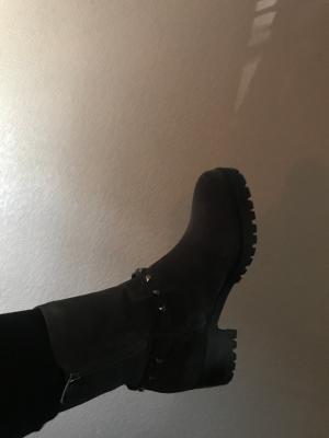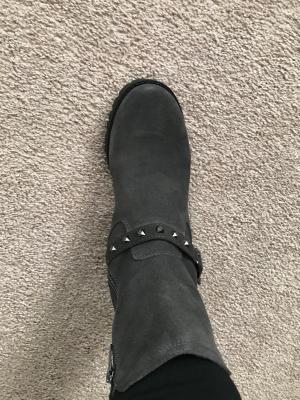 These boots are really cute. I purchased the grey suede and the black leather ones. I am wearing the grey ones right now and the really comfortable on. They look great with leggings, skinny jeans, skirts and dresses. The foot bed is nice because it is not tight. Love !! Great sale!! Thank you Macys!
