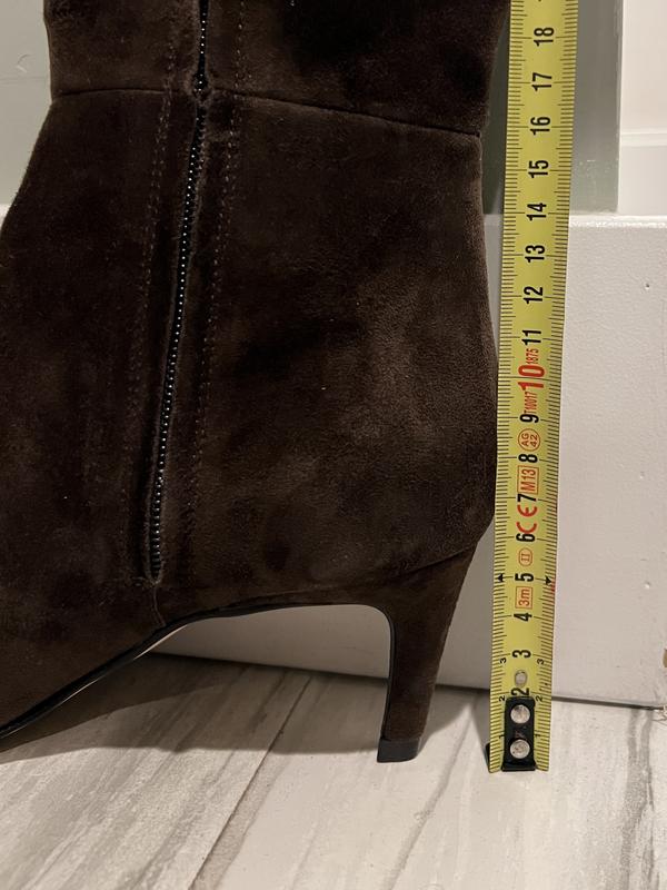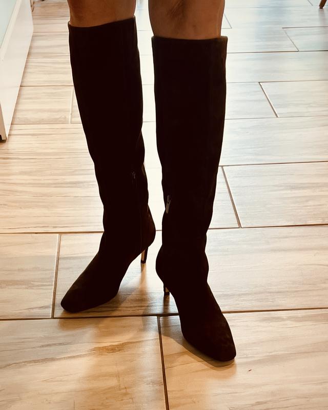 I'd like to correct the misleading website info since I measured the boots. The heel is not 3.27". It is barely 6mm high (just under 2 3/8"). The shaft hits my mid-knee so it's taller than most boots. Circumference of the top of the boot is 15" around. My calves are 13.5" so these were roomy for me. The suede is a dark rich brown, it's real and not manmade which is the reason I bought them. Soft, seems like good quality and a solid investment for many cold nights out. Love them and even happier that I could get them on sale.