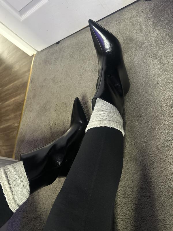 I purchased these booties for work. They are a nice addition to my work wardrobe. They do feel a bit long in the toe area. I wear a 9 but could have purchased an 8.5. The extra space causes my foot to slide a bit making them a tad uncomfortable. The heel height is perfect for a long day in the office. They pair well with pants, dresses and skirts. Very versatile.