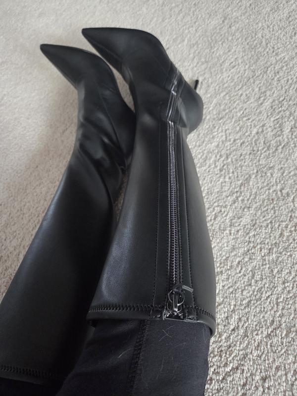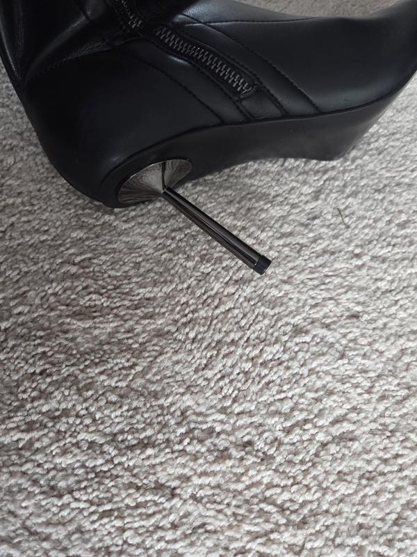 These boot had the silhouette I've been looking for. They fit nicely on small calves. However, I put them on the wrong foot at first because the zipper is on the OUTSIDE of the boot? Why? That is the exact opposite of the way it should be. Also note, these are not real leather. The heel is metallic black. Don't love it, but not a deal breaker. Not sure if I will keep these. The zipper on the outside of the leg is just off putting.