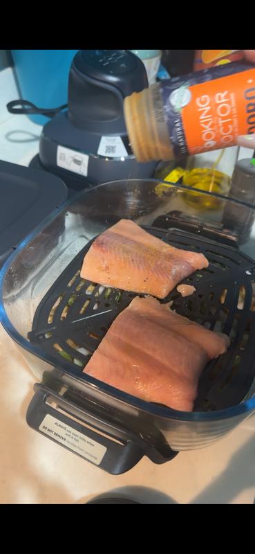 There’s two different containers to cook foods in and it does a really good job of wings, salmon, chicken, and squash, that’s all I’ve tried so far. It’s like a little mini oven. Can’t wait to try more! I just wish the feet came off cuz it’s hard to wash/dry between the glass and the feet