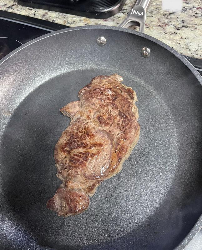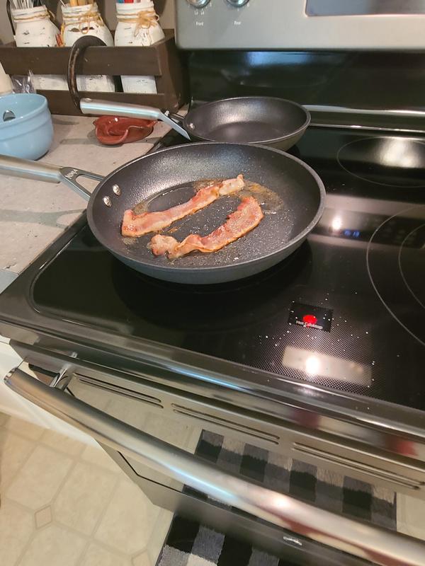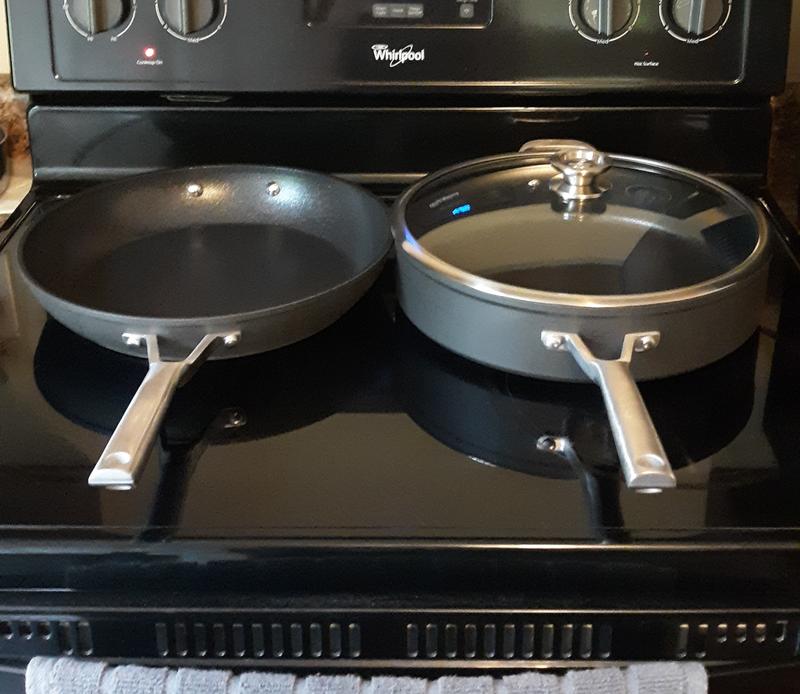 I have these 2 Ninja never stick skillets. So far they have performed as stated and are very non-stick. They are a great size for cooking large meals. They wash up easily and store great on top of each other.