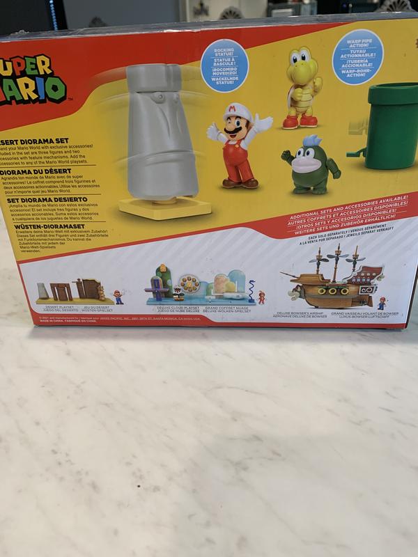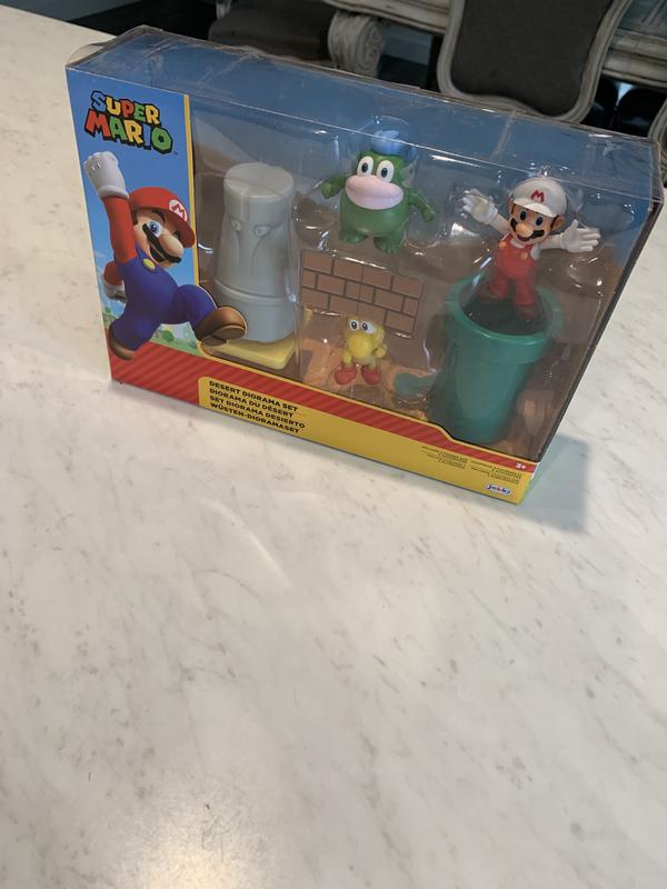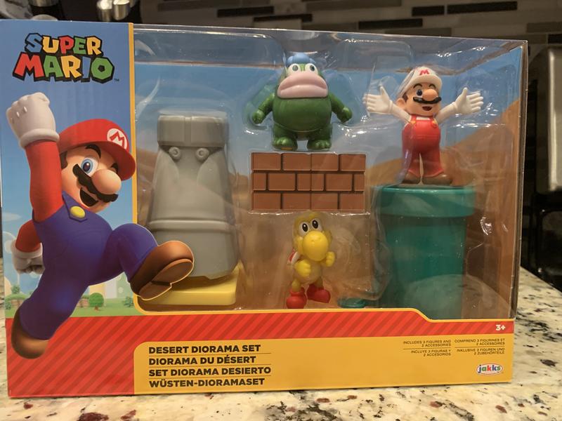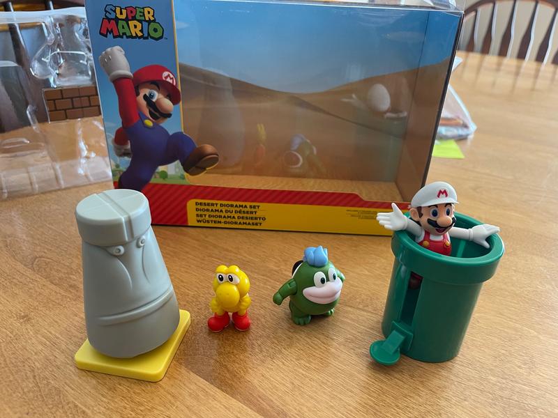 This Nintendo Mario desert diorama set is great. Brings back memories of playing Super Mario as a kid. My 6 year old son loves it. He was so excited when he saw it. He has being playing with it for days. Mario is in his white fire power suit. The green tube has a tab to make Mario go up and down in it. The stone guy wobbles too.