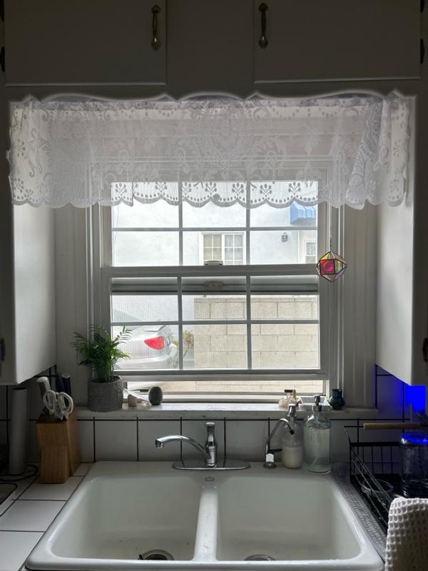 I really like this curtain, the lace is really pretty and it reaches across my window perfectly the only thing I didn’t like however was the length of the curtain, if it was a bit longer I think it would’ve looked better, but that’s just my opinion! I would definitely recommend if you’re looking for a cute kitchen curtain.