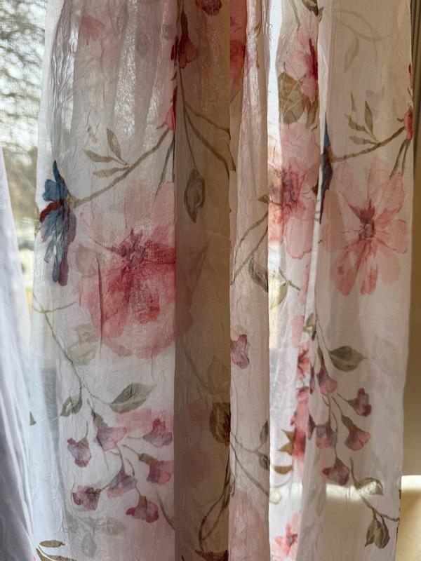These curtains are really pretty, I love the pink floral pattern. The fabric itself is textured which is nice so it does not show wrinkles. I already had curtain rods installed so they were very easy to put up. They are sheer so you can see through them and they let in lots of light.