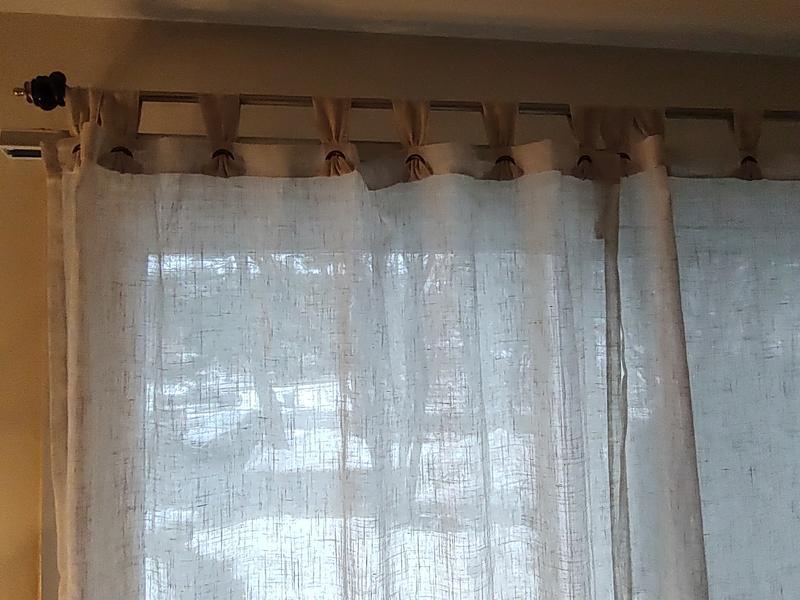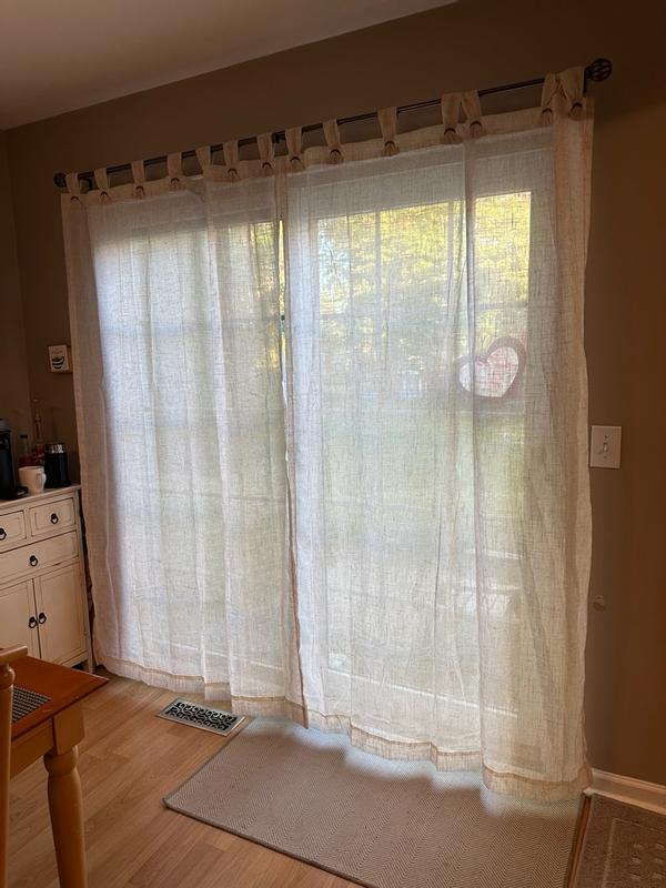 The curtain was easy to hang thanks to the tab top design, which slid smoothly onto a standard curtain rod without any issues. The fabric is sheer, allowing natural light to filter into the room while still softening harsh rays, which helps create a bright yet comfortable atmosphere. I also appreciated the nice finished edges, which give the curtain a clean and polished look. One potential downside for some might be the moderately thick edge along the bottom of the panel—about 2 to 3 inches—which is relatively visible due to the sheerness of the fabric. While it didn't bother me, it's something to consider depending on your aesthetic preferences. Overall, it's a lovely curtain that blends function and style nicely.