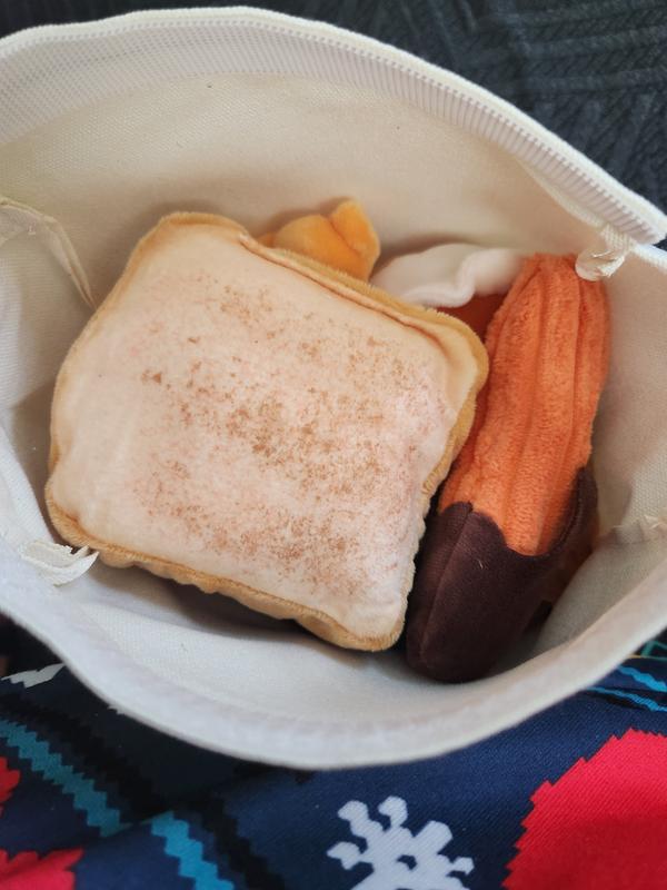 Adorable dog toy. Puppy loves the crinkly pieces and the bag is very cute and practical.