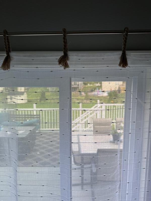 Love this boho style sheer curtain. The rope tab tie adds uniqueness to it. The stripe on the sheer adds to its charm making it look very luxurious