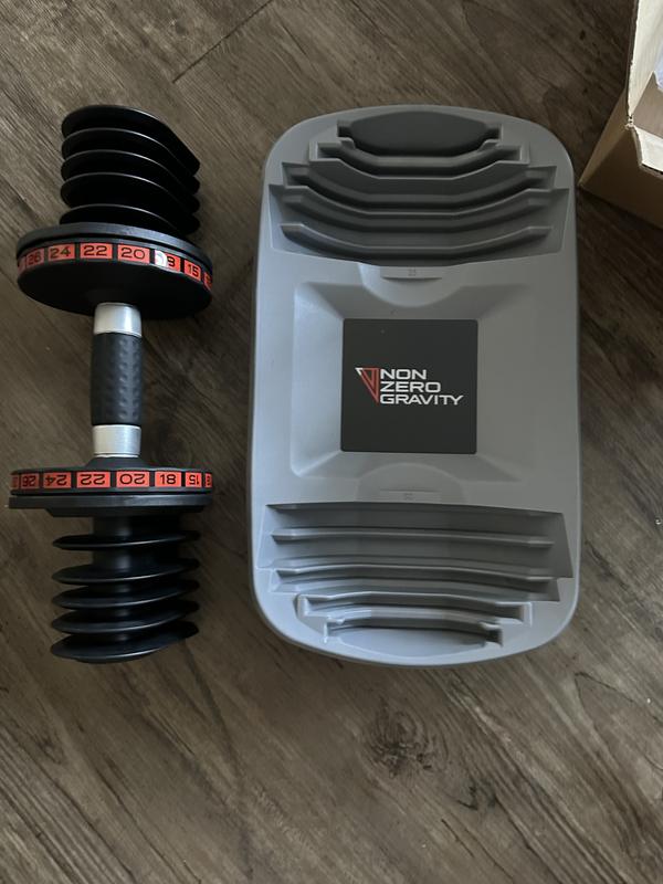 The Nonzero Gravity PowerDyne Adjustable Iron Dumbbell Weights, 55 Pounds are awesome! It is a unique dumbbell weight system and very well made. It took me a few tries to figure out how to set it up, but I eventually discovered how it all worked. My current dumbbell weight set took up a lot of space. It also took me a bit of time when I wanted to add or decrease the weight on them. This system does it all for you with just a twist of the handle. You can set your weights ranging from five to 55 pounds in one quick motion! If you are wanting to decrease the weight, simply twist the handle after a quick click of button and this convenient tray that it sits in will leave the rest of the weights behind. If you want to add weight simply place the dumbbell back into the tray and after pushing the ends in, you can twist the dumbbell handle to the desired weight, click on the button to lock it and lift it out of the tray! Genius idea! For now, I am using it on the minimum weight of five pounds until I become more used to it. I will increase gradually over a period of time. I cannot say enough good things about this space saving weight system! If you are able to invest in a dumbbell system for your home gym, this would be the one!