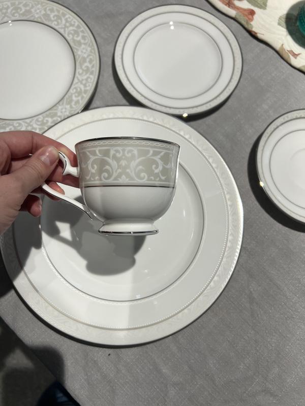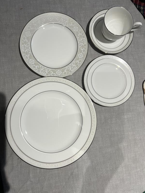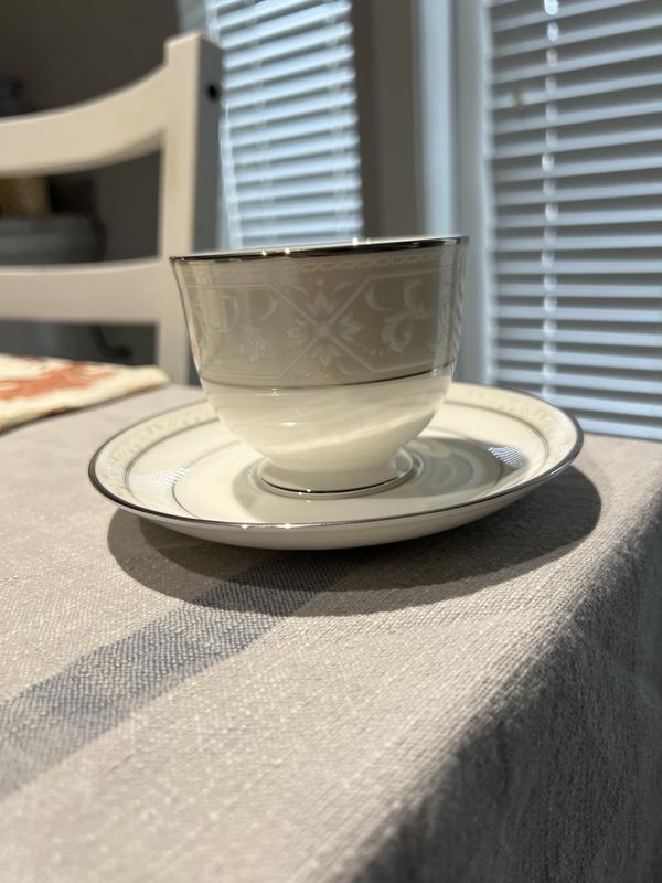 Montvale platinum features a narrow rim decoration of delicate white scrolls laid over a champagne-colored background, edged in platinum. Crafted in fine bone China, Montvale platinum offers place setting components as well as an array of serving pieces and accessories.