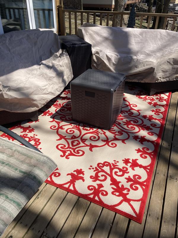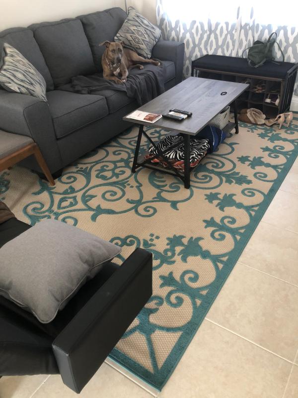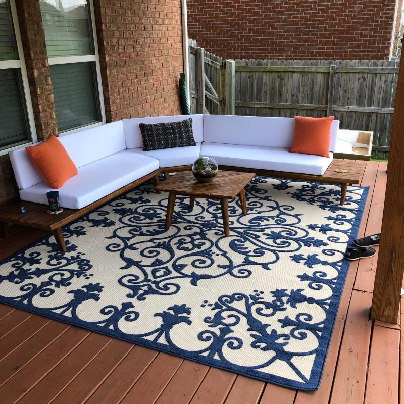 This rug is so bold and elegant. It looks just like the photos and the quality is excellent! Very soft and nice to walk on. We just bought our house and I finally have the patio of my dreams. We love it!