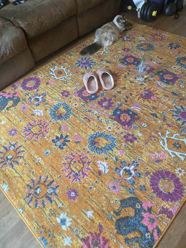 I was looking for a low maintenance, large rug to brighten up my apartment. So pleased with my purchased. Brighter, happier colors than I expected. Great for the pets (durable) and appealing to the eye. Great find!