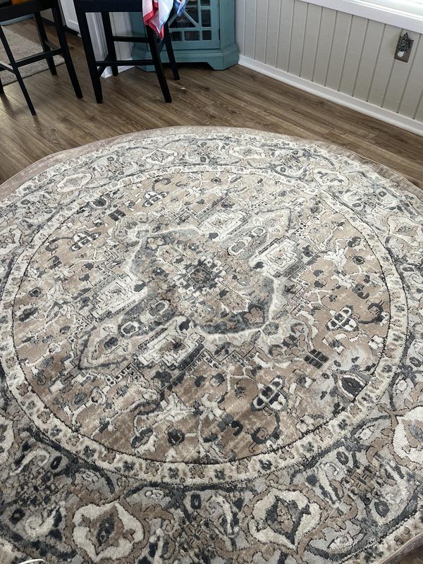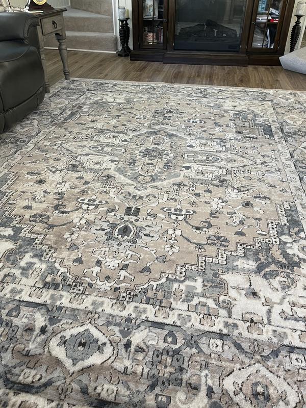 My kitchen nook rug arrived. It was all that it said in the description and more! I needed a low pile rug because of the placement of my back door and this fit the bill. The colors are beautiful, although the different color grays in the rug take on slightly blue tone ( I was not expecting that). It still works.