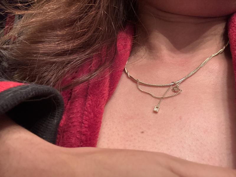 The necklace is attractive. However, the design of how the two chains are attached allows them to constantly tangle. Cannot wear it but just a couple of minutes before the necklace is rolled/woven itself tightly. Will be returning this item for refund.