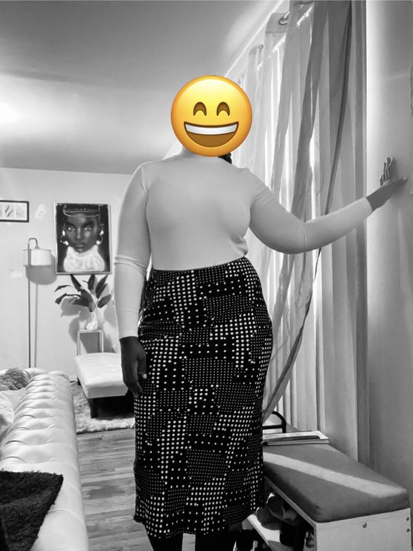 This skirt is a keeper! Skims my ankles as I am 5’1” (barely) 103 lbs, but keeps close to the body. Love the elastic waist that doesn’t look like it’s elastic. Will wear this all summer long. Bought an xsmall and I love it. Pairs with sandals, low platforms or flip flops.