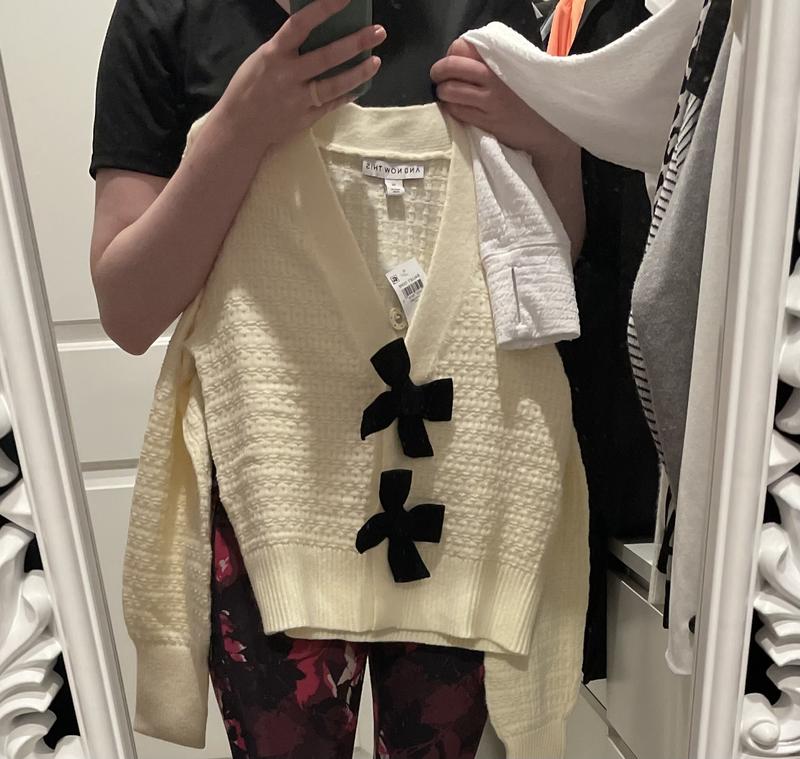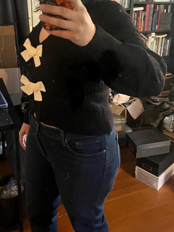 I love this Bow cardigan. I saw a friend wear this and I needed my own. It is a crop cardigan, so go up a size if you want it a little longer. I can wear an XS, but I got the S. The sweater fit a little lower than my waist. It is super cute! Grab one if you can!