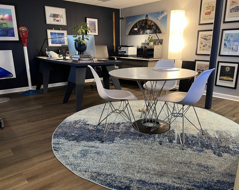 this rug almost looks like an abstract of city buildings around a lake. I like the various colors which work well with my blue green sofa.
