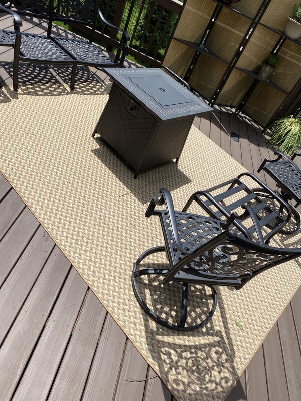 Great rug. Love the color and the herringbone design. Fits perfect on my patio. Would recommend