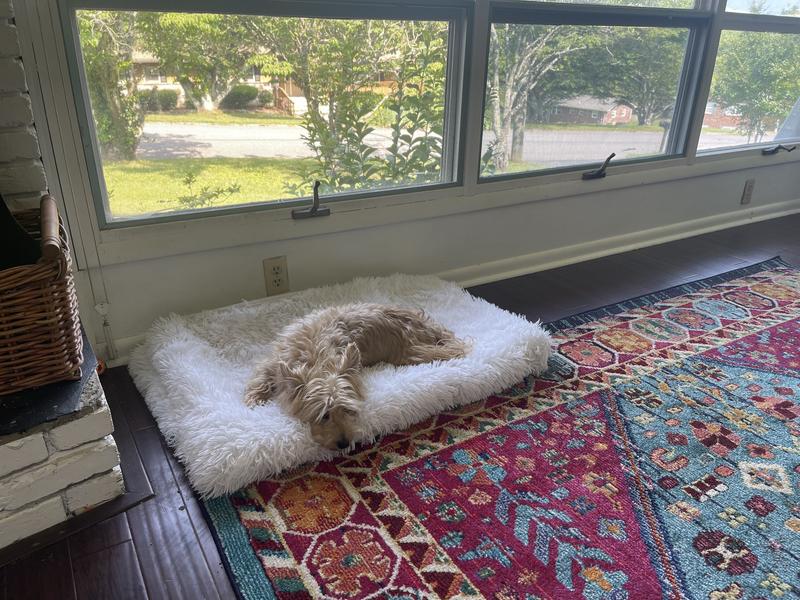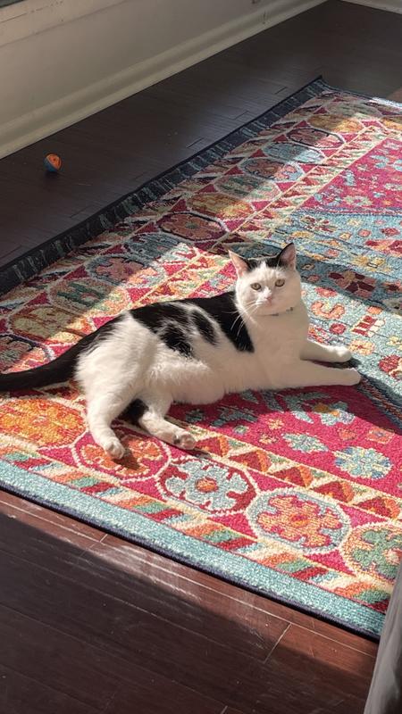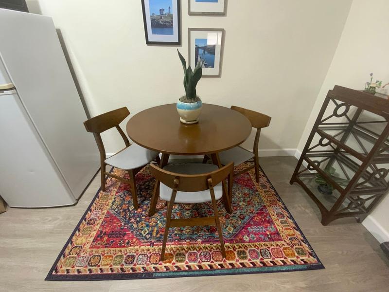 Inexpensive rug that is just the right size for my small apartment. Colors are vibrant and the rug goes well with my dining table.