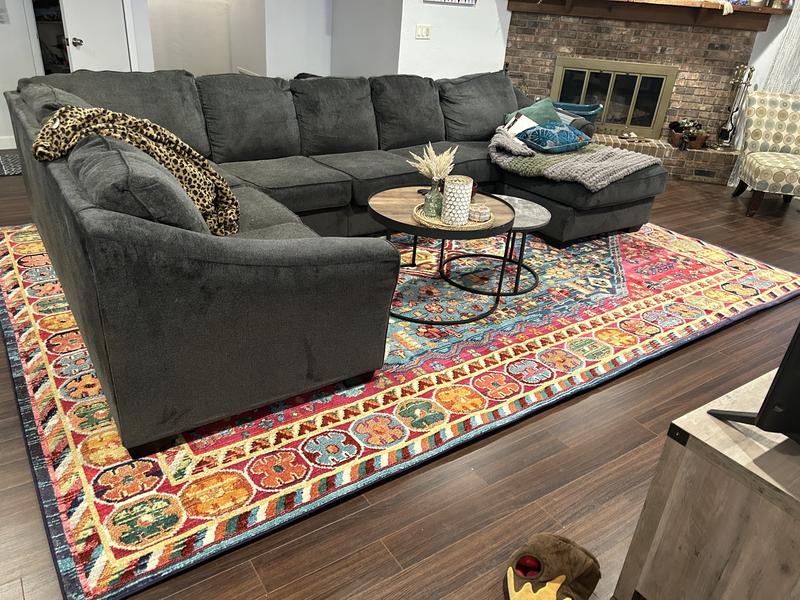 Beautiful rug! Its plush, the colors are vibrant. It is just perfect and looks awesome in our living room