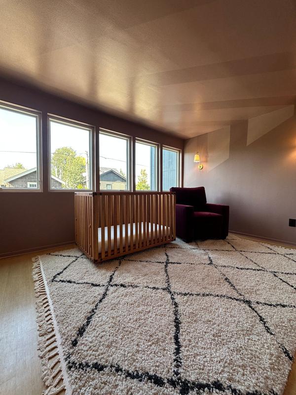 I bought this rug for my daughter’s nursery and it’s perfect! It looks exactly like the photos and is incredibly soft underfoot. No smells or shedding out of the box — just some crinkly parts from shipping that will flatten over time.