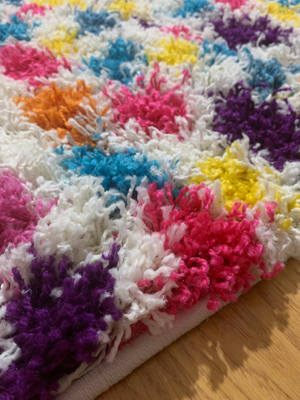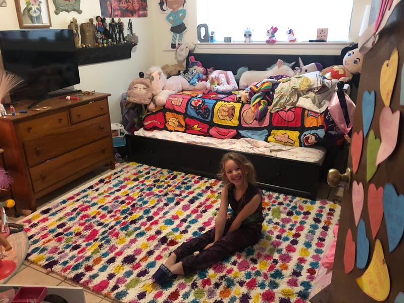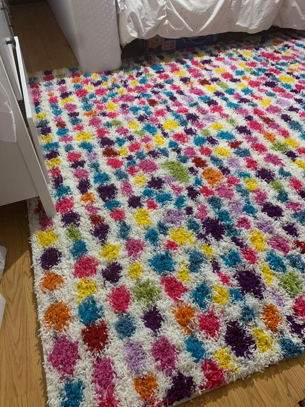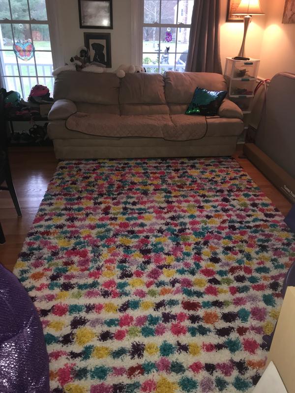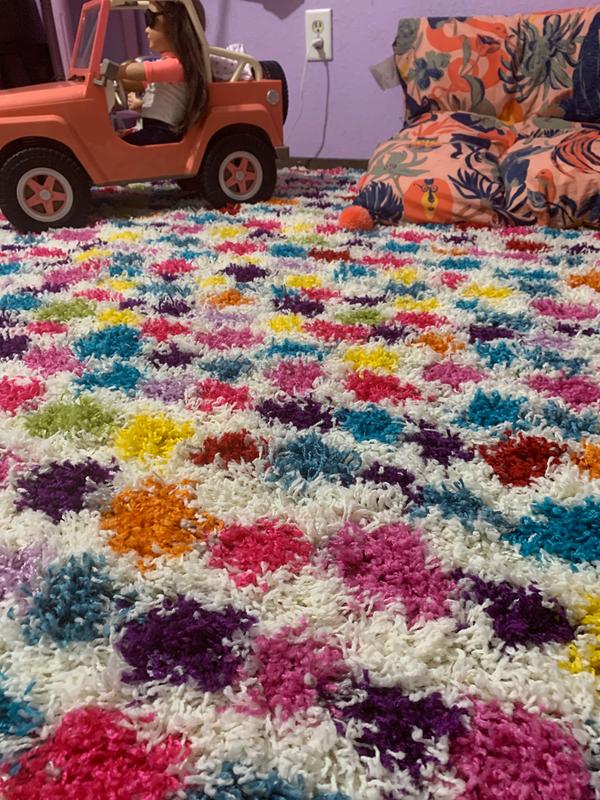 I bought this rug for my daughters' playroom and it's perfect. It feels soft and fluffy under their barefeet. The bright colorful polka dots brighten up the room and has garnered tons of compliments from guests.