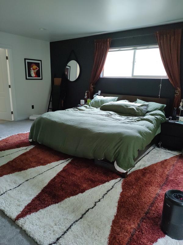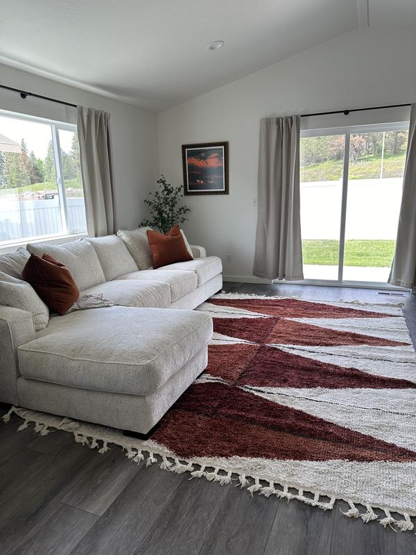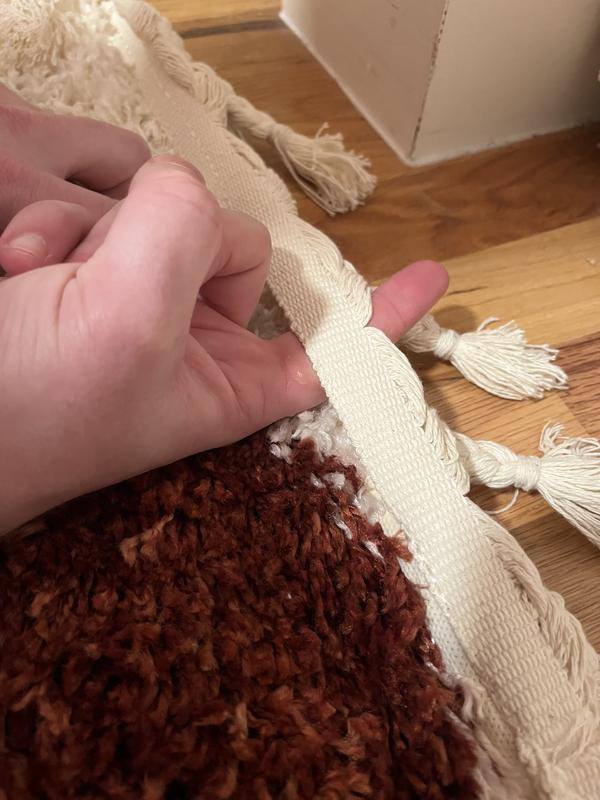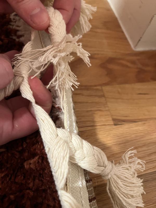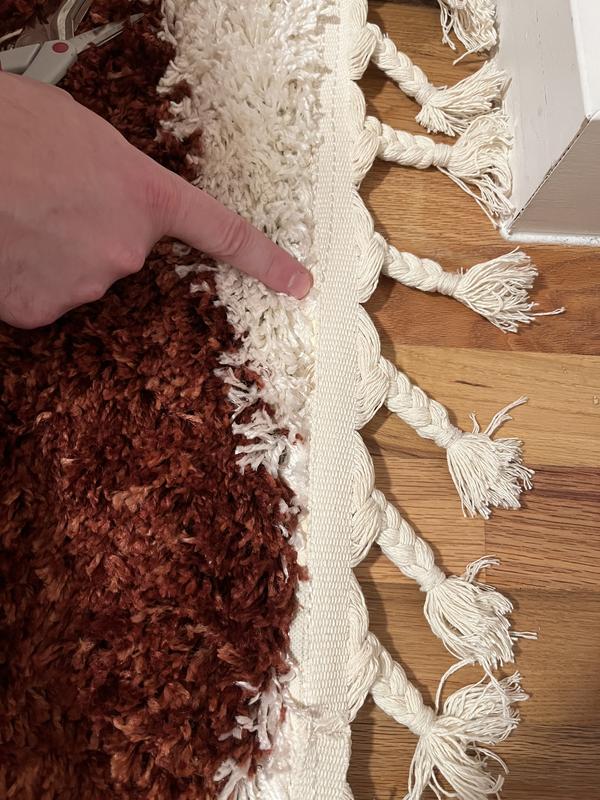 Will hold the place until we get another rug. It’s nice and fluffy at first but once you get past the shag top, it’s just a thin line of plastic squares. That material has been pulled through not my favorite, but we’ll do until we get another rug.