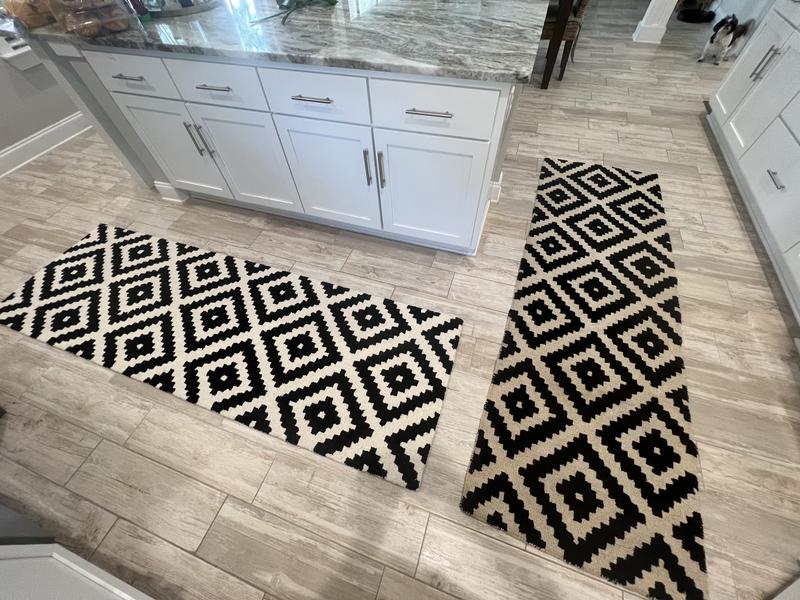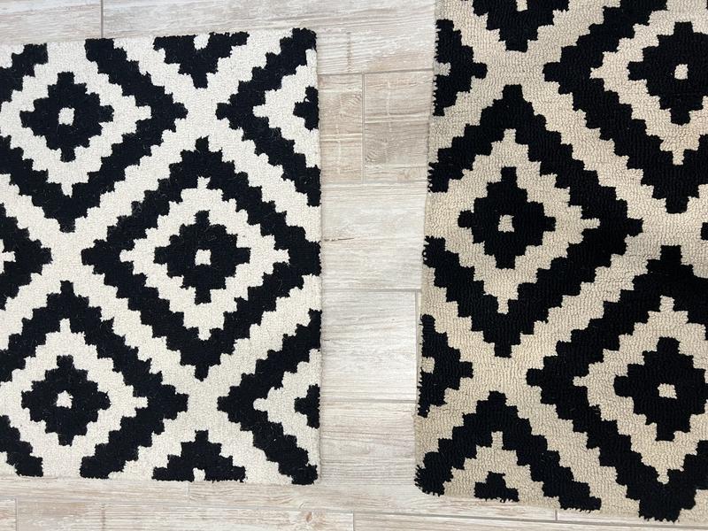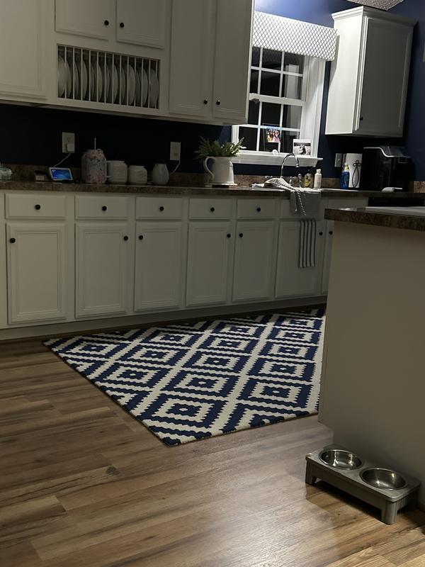 Love this rug. Minus one star due to the pattern not going all the way to the edges in places. Makes the rug look worn with navy yarns missing in sporadic places....Overall, great rug for the price considering it was on clearance.