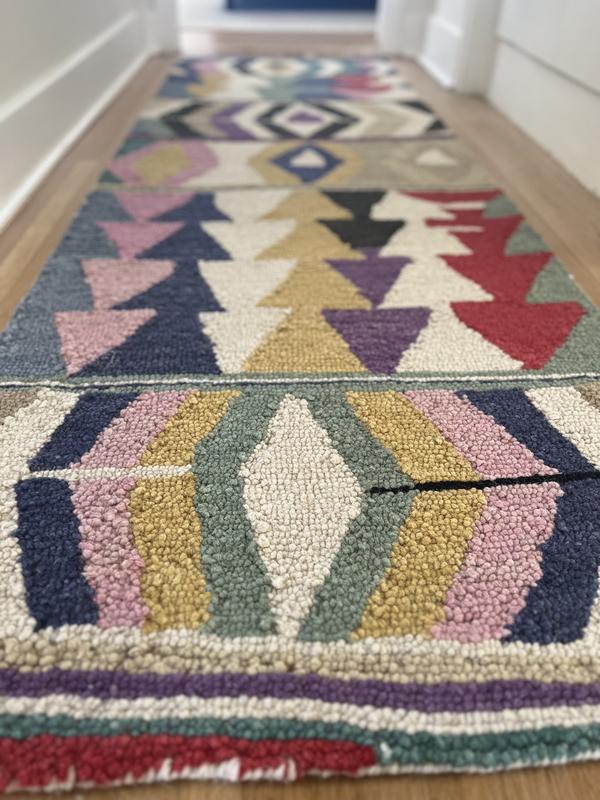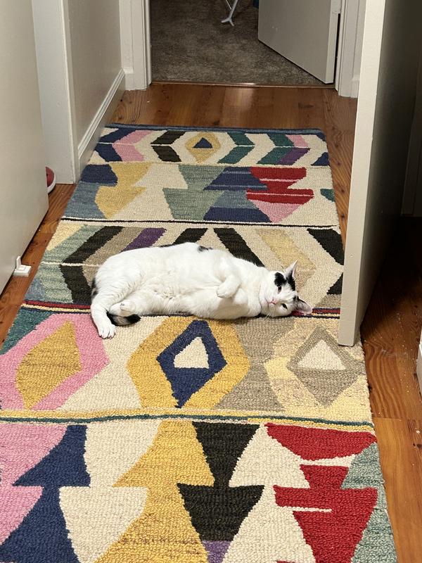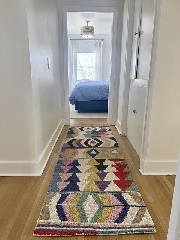 This wool rug is of great quality, with fun colors. I used it in my closet as a runner, but also got a large one for the playroom. In person, the white tones are off-white/beige, if you are trying to color match.
