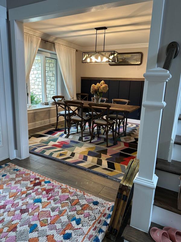 I adore the look of this rug! It makes the dining room pop with color. It seems to be of good quality; however, when it was delivered it was left in the driveway in the hot sun. The plastic wrap contained much condensation inside which tells me the rug was damp when packaged. It doesn’t smell very nice. While it looks great, it doesn’t smell great