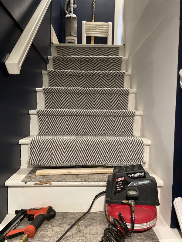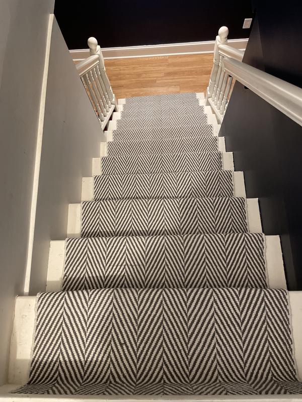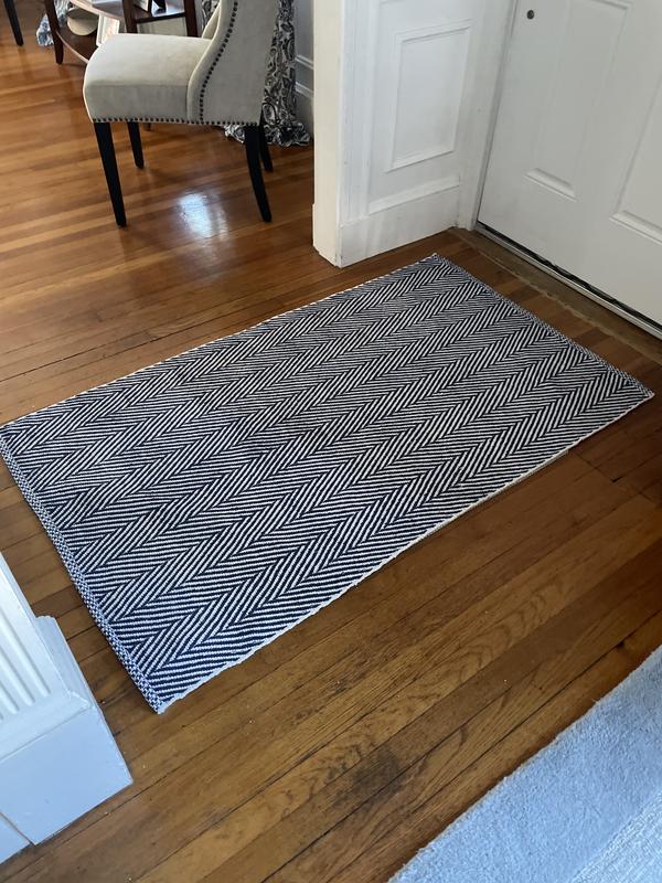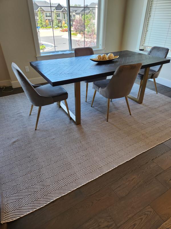 This rug looks gray in the photo, but in reality it has gray and white stripes in the herringbone pattern (50% white). I would never have ordered a white rug had the photo been accurate.
