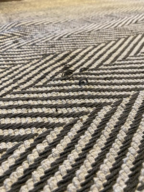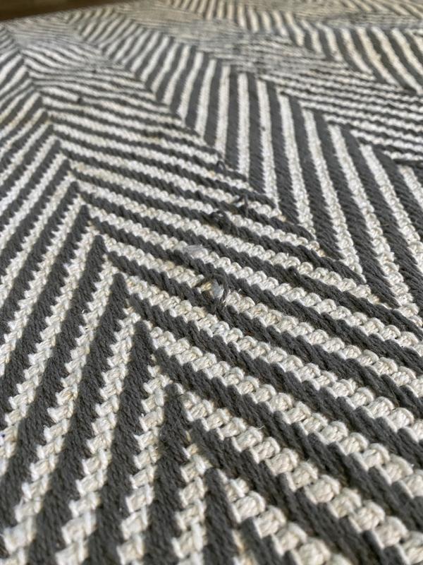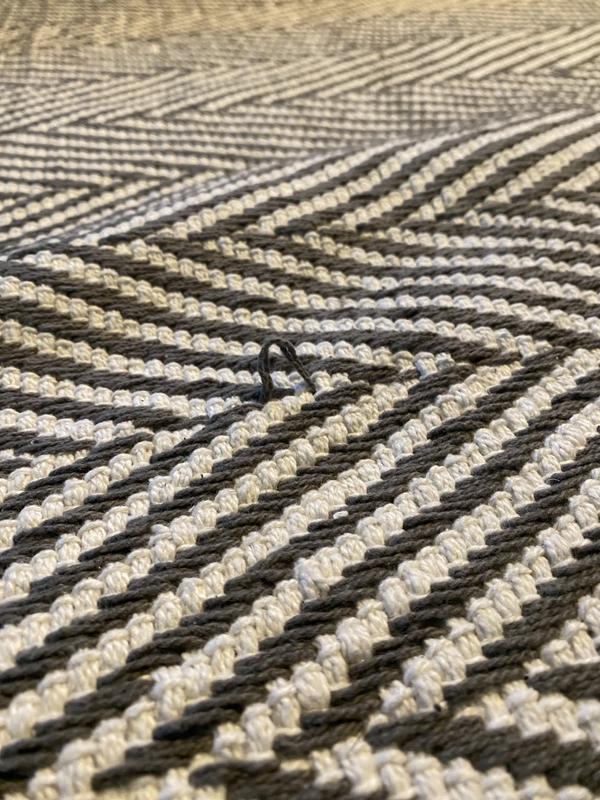 This rug looks gray in the photo, but in reality it has gray and white stripes in the herringbone pattern (50% white). I would never have ordered a white rug had the photo been accurate.