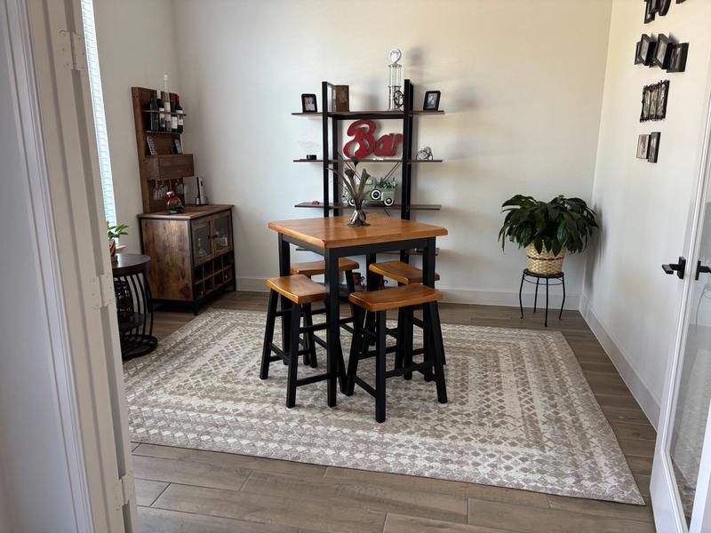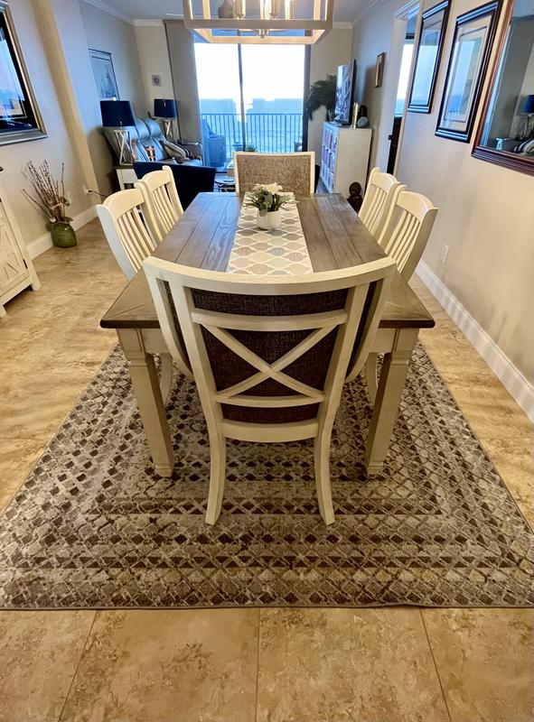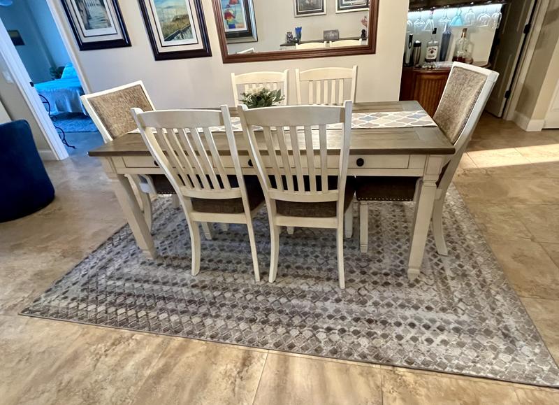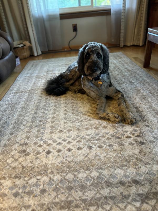 Beautiful rug, easy to clean (I have a large dog and 2 cats). I had company for two weeks and they raved about how nice the rug was and easy to clean in my dining room.