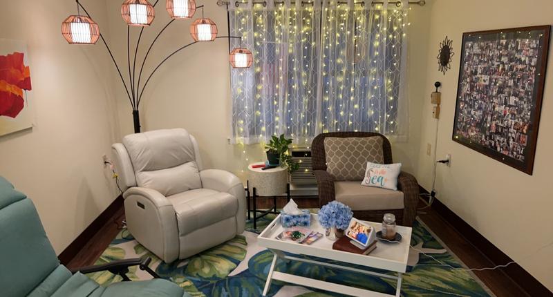 Perfectly defines the area, graced with vintage butterfly chairs.