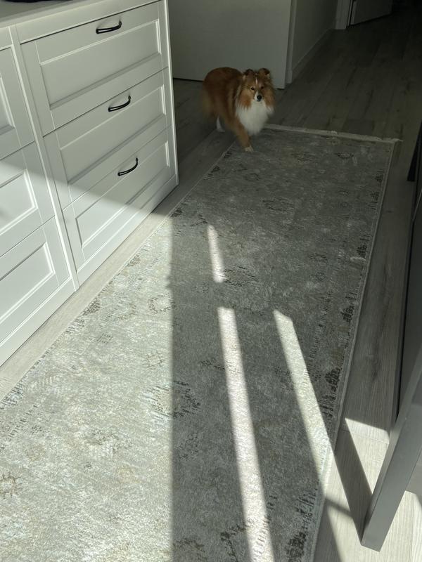 Beautiful rug, looks even nicer than in the photo. It's got a silvery shine to it, but not too much, and it's very soft. Unfortunately our dog had an accident on the first day, and it's impossible to clean, even though I followed the instructions.