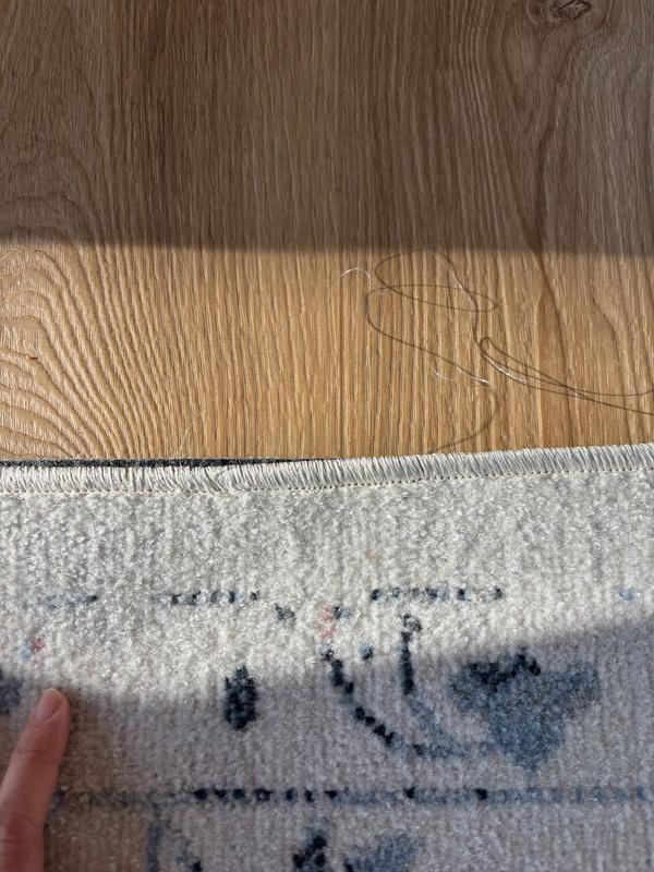 The actual rug is shiny looking - cheap polyester threads. Very disappointed. The pattern looks more dense in the photo but looks washed out in person.