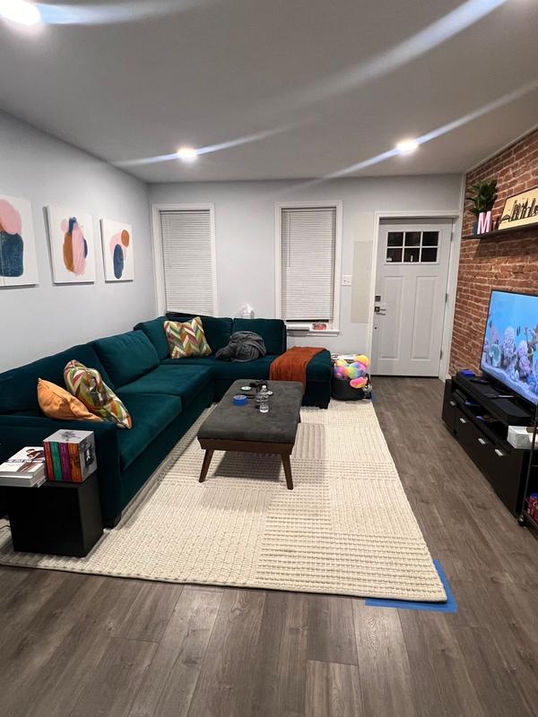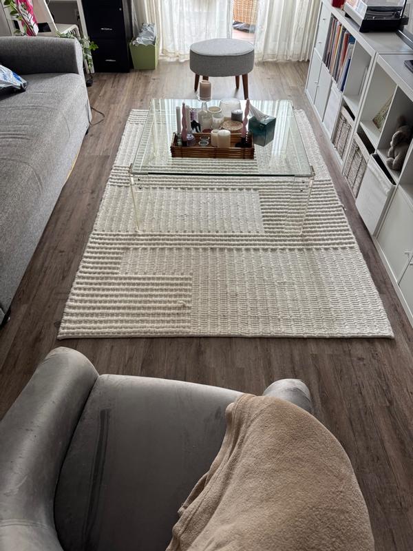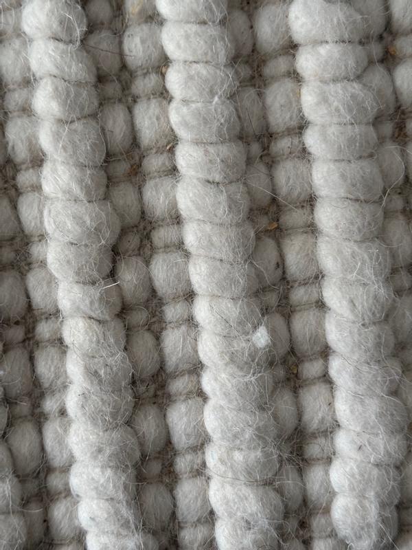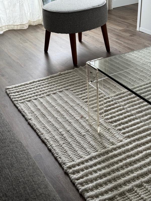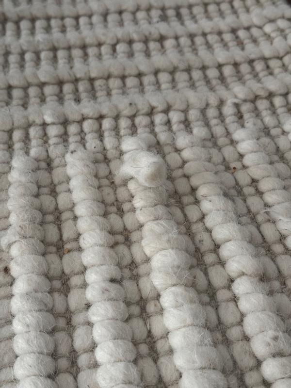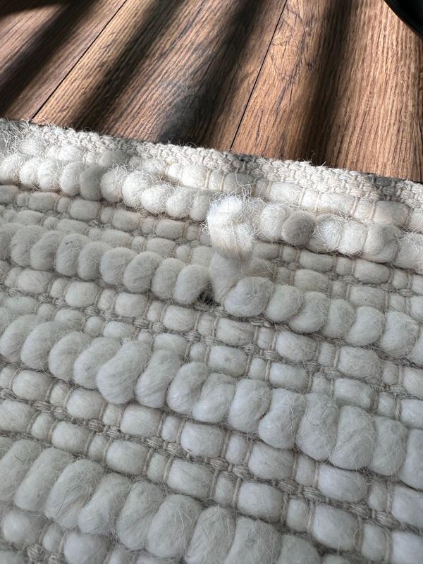 Love this rug, especially for the price. It’s a bit nubbier than I was expecting, so it might be challenging to keep clean. It also has a smell to it, that seems to come with changes in humidity. I’m guessing it’s the wool, and hope that it lessens over time.