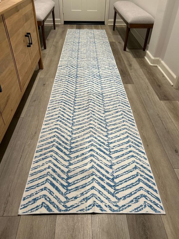 The pattern is not as suggested, it’s further apart and the blue is a brighter blue then shown in the pictures, nice rug just not what I was looking for.